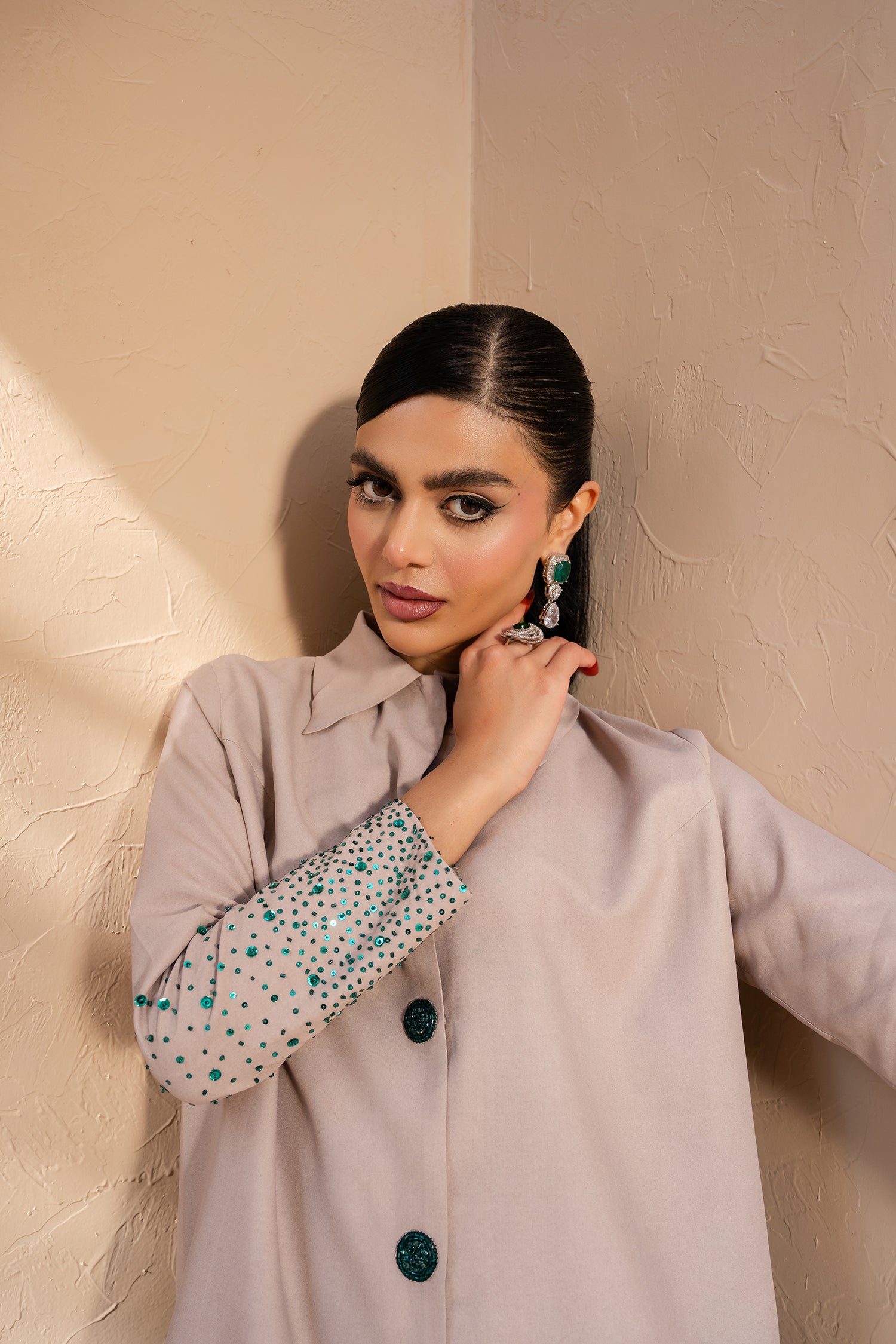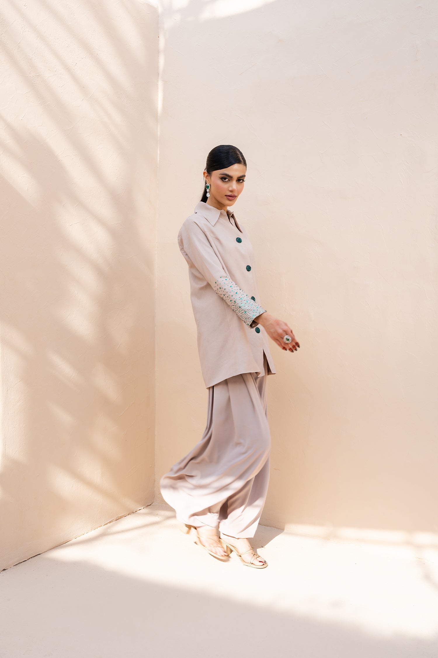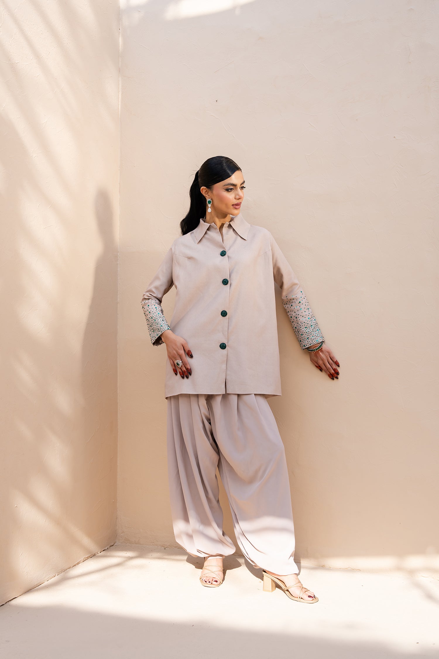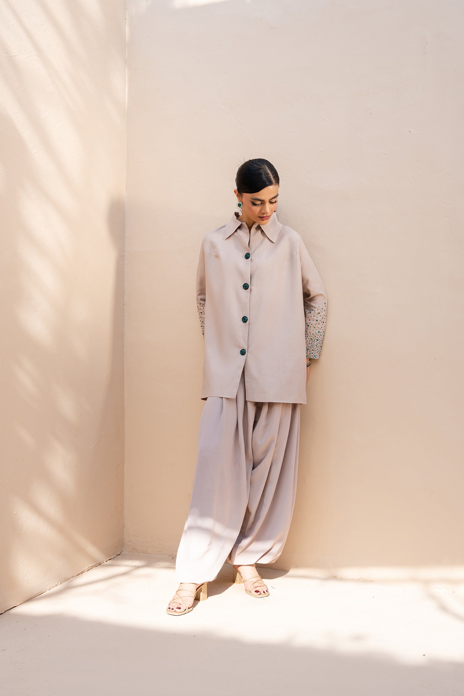 Subtle emerald spray embellishment on the sleeves adds delicate shimmer and intricate detail, enhancing the silhouette with quiet statement appeal. Paired with relaxed yet structured balloon pants, the set offers a fashion-forward shape that feels effortless, polished, and commanding.
