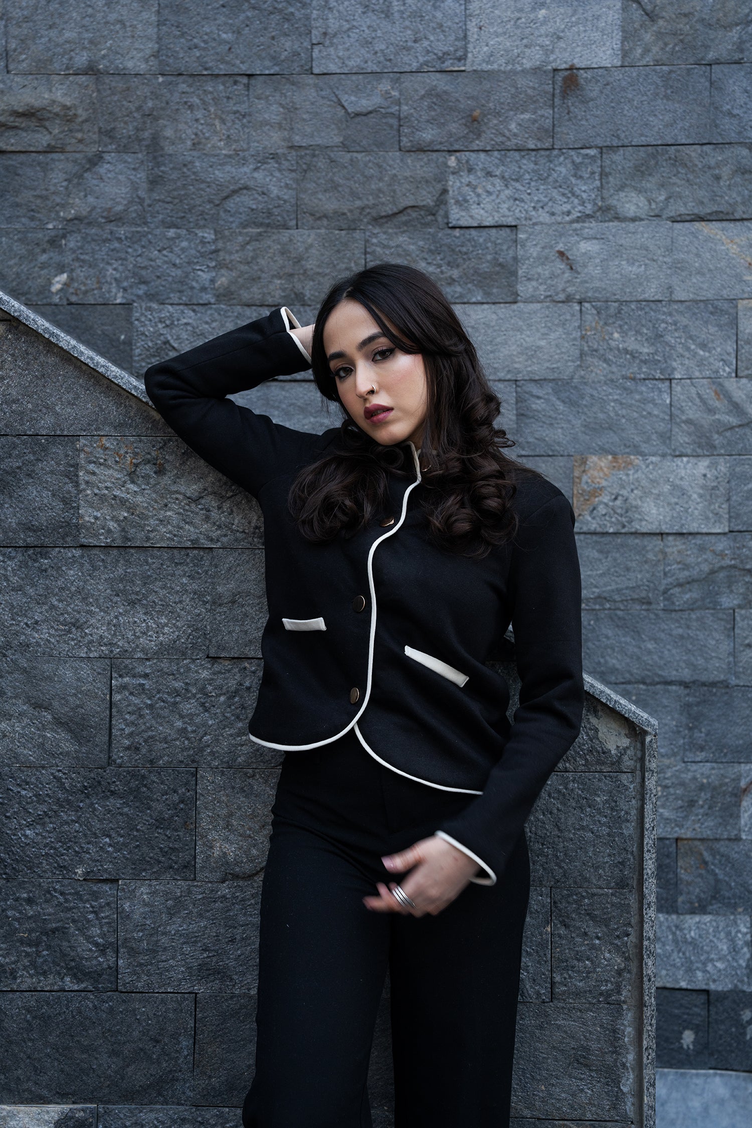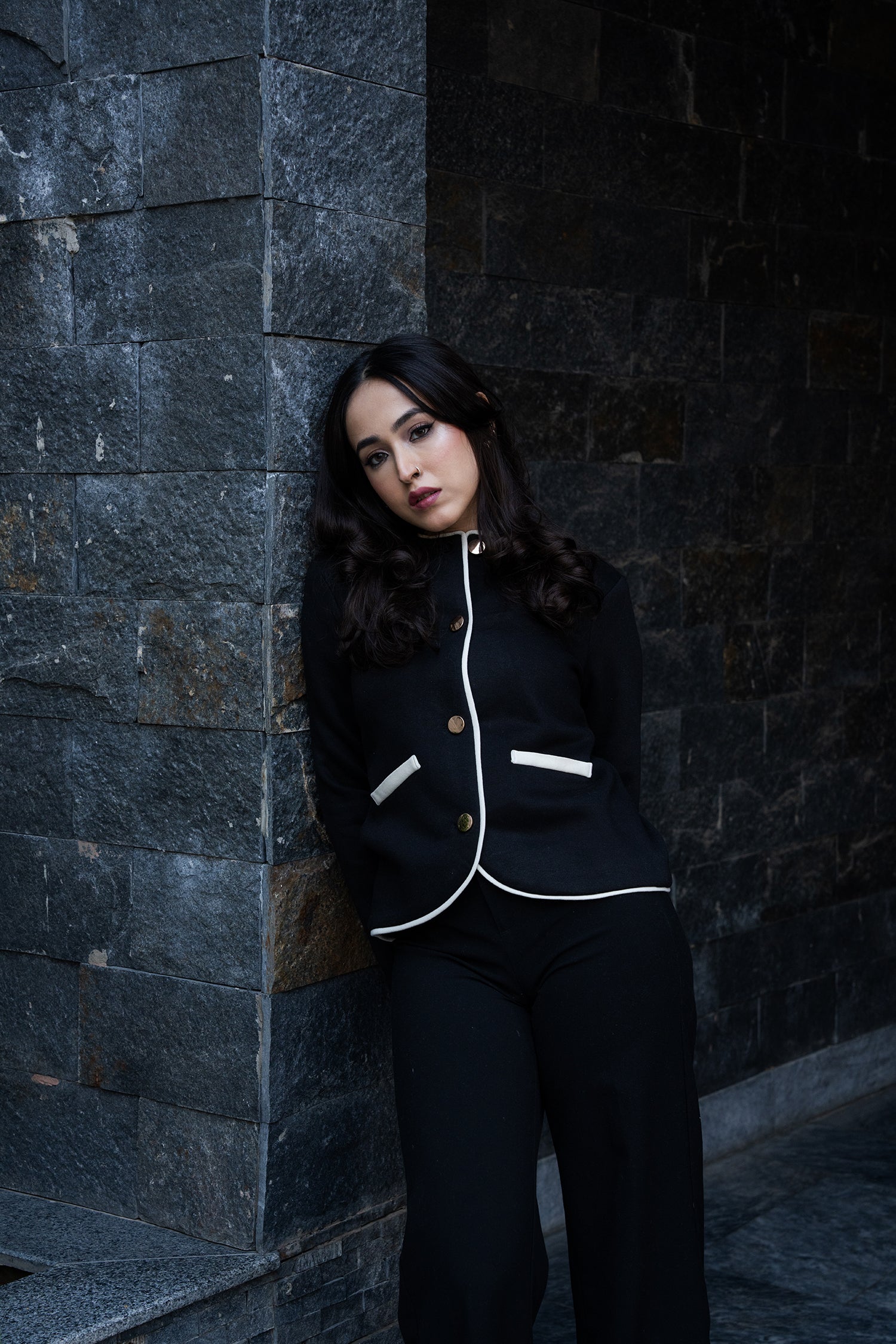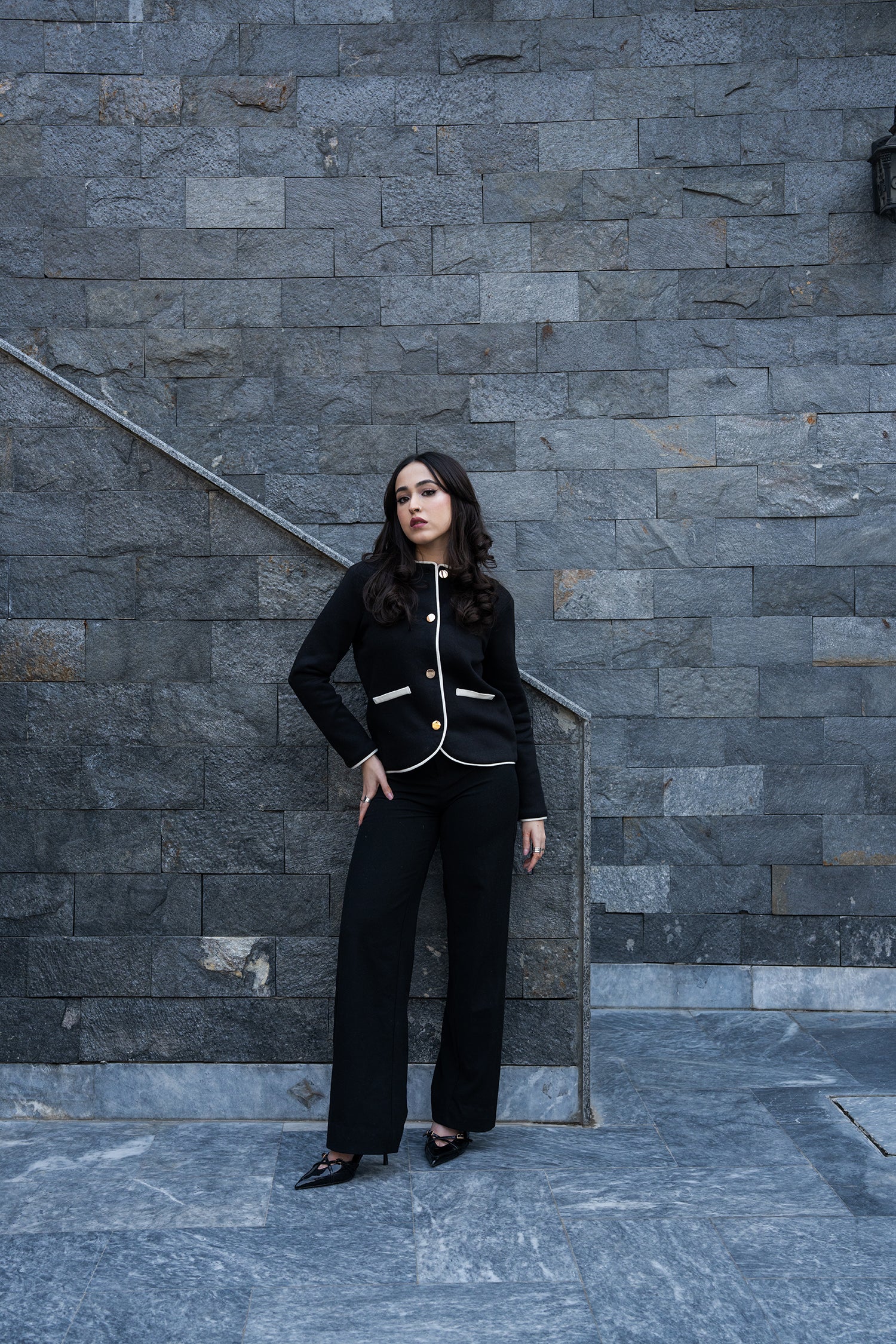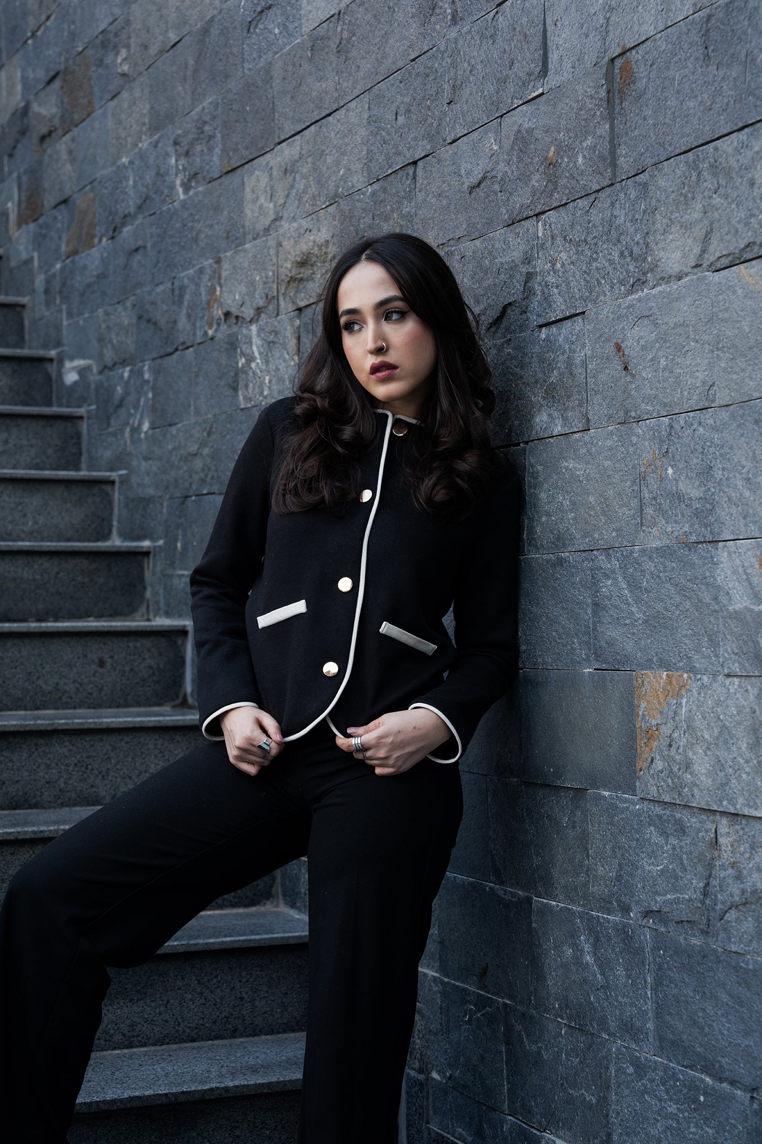 stay effortlessly chic and cozy with this jet black top. The cropped top features asymmetrical gold buttons for a statement finish.