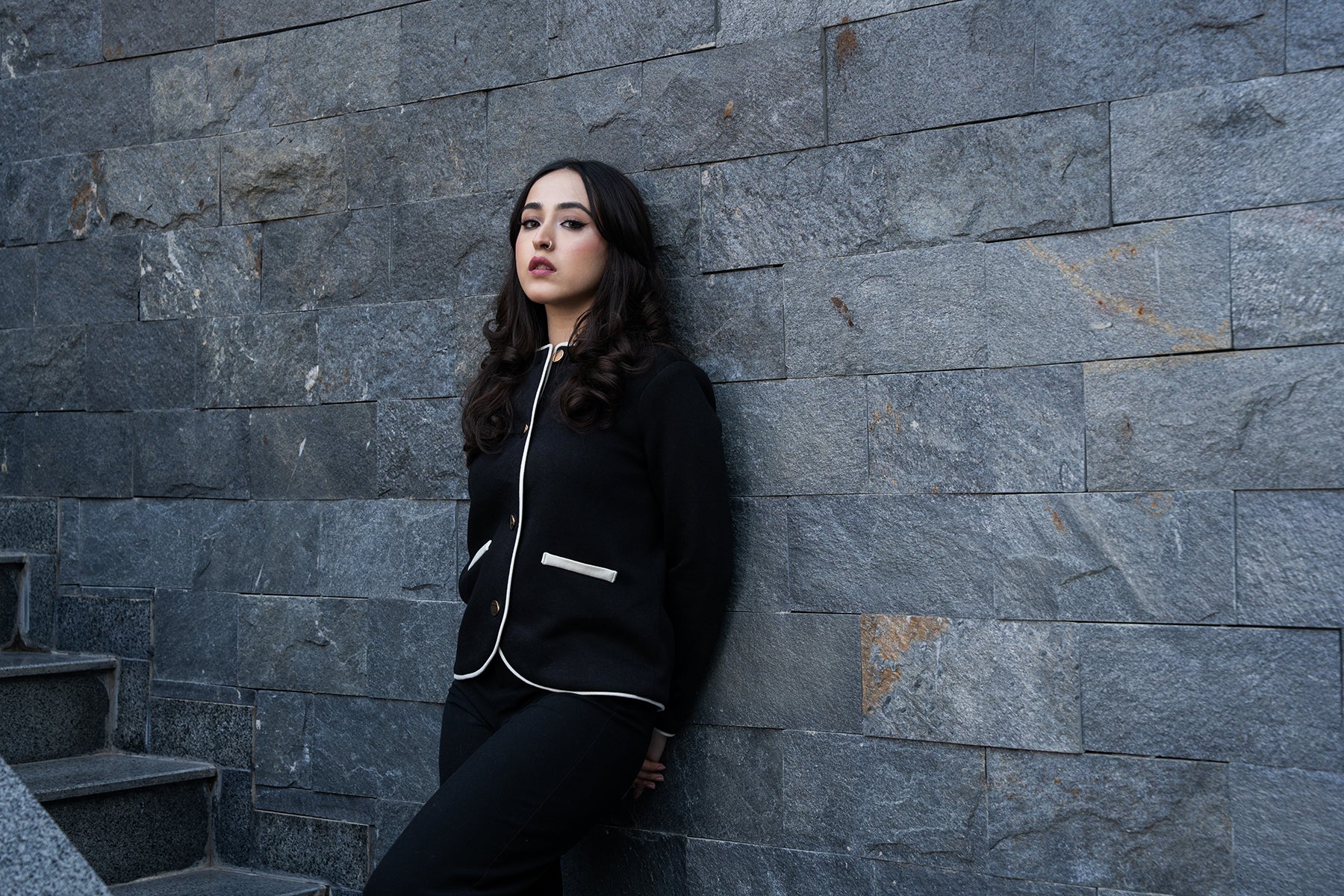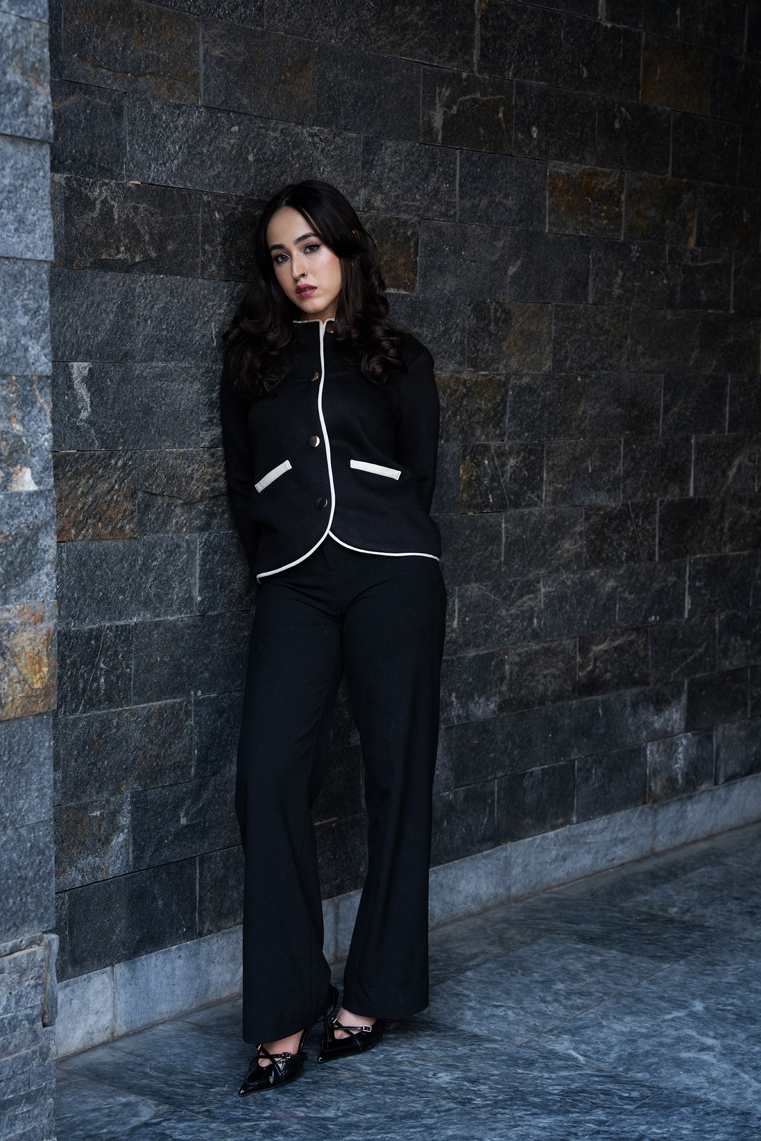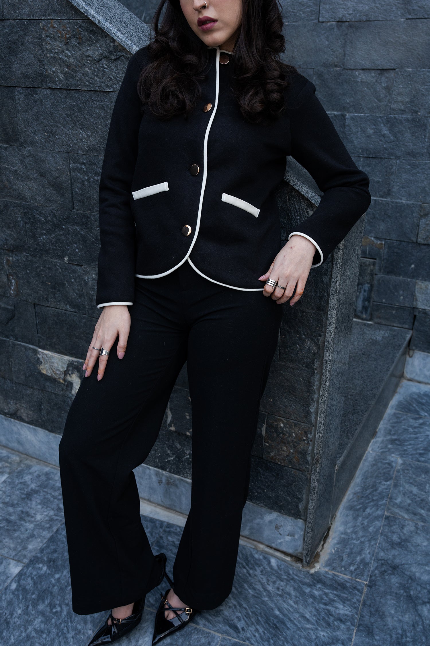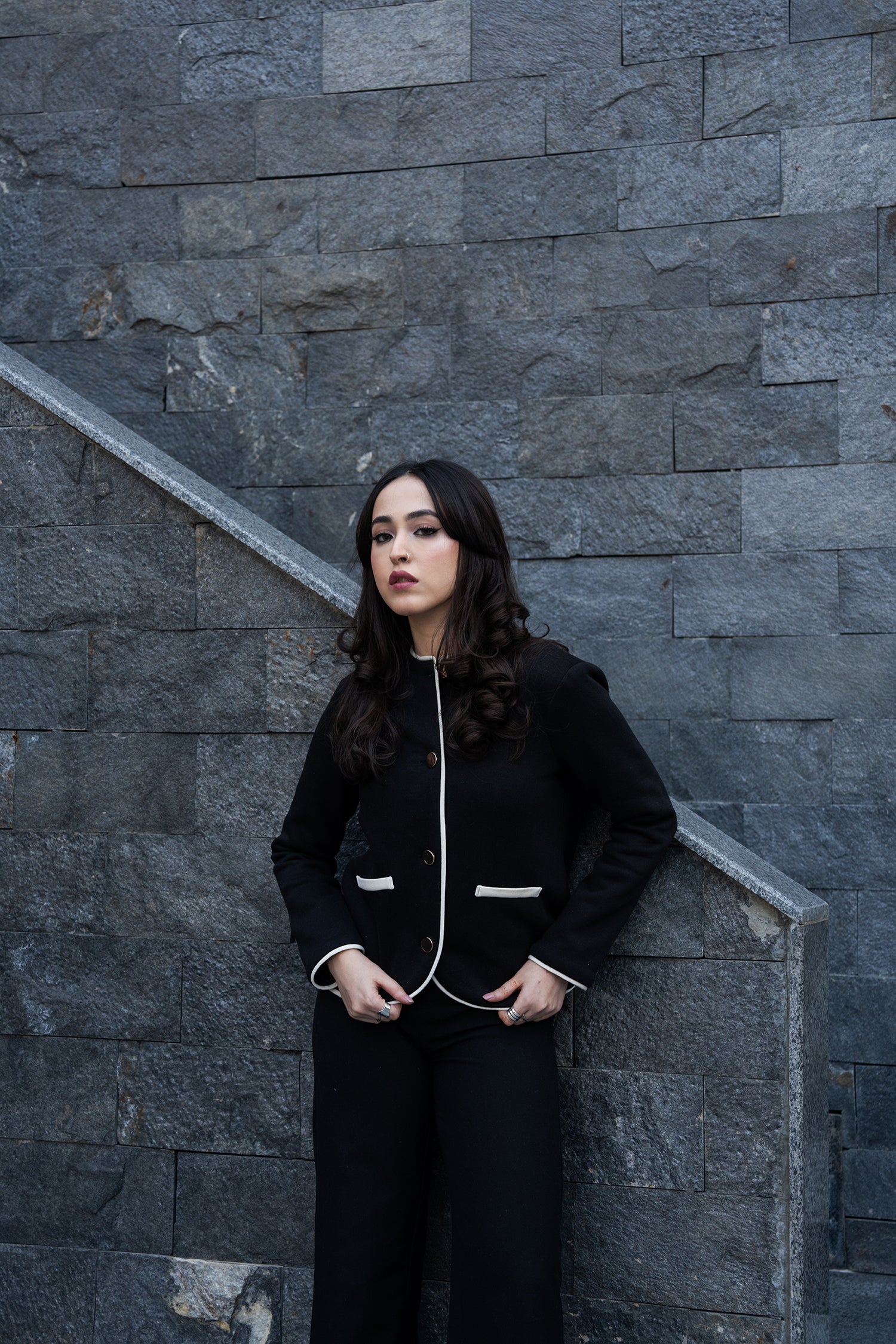 stay effortlessly chic and cozy with this jet black top. The cropped top features asymmetrical gold buttons for a statement finish.