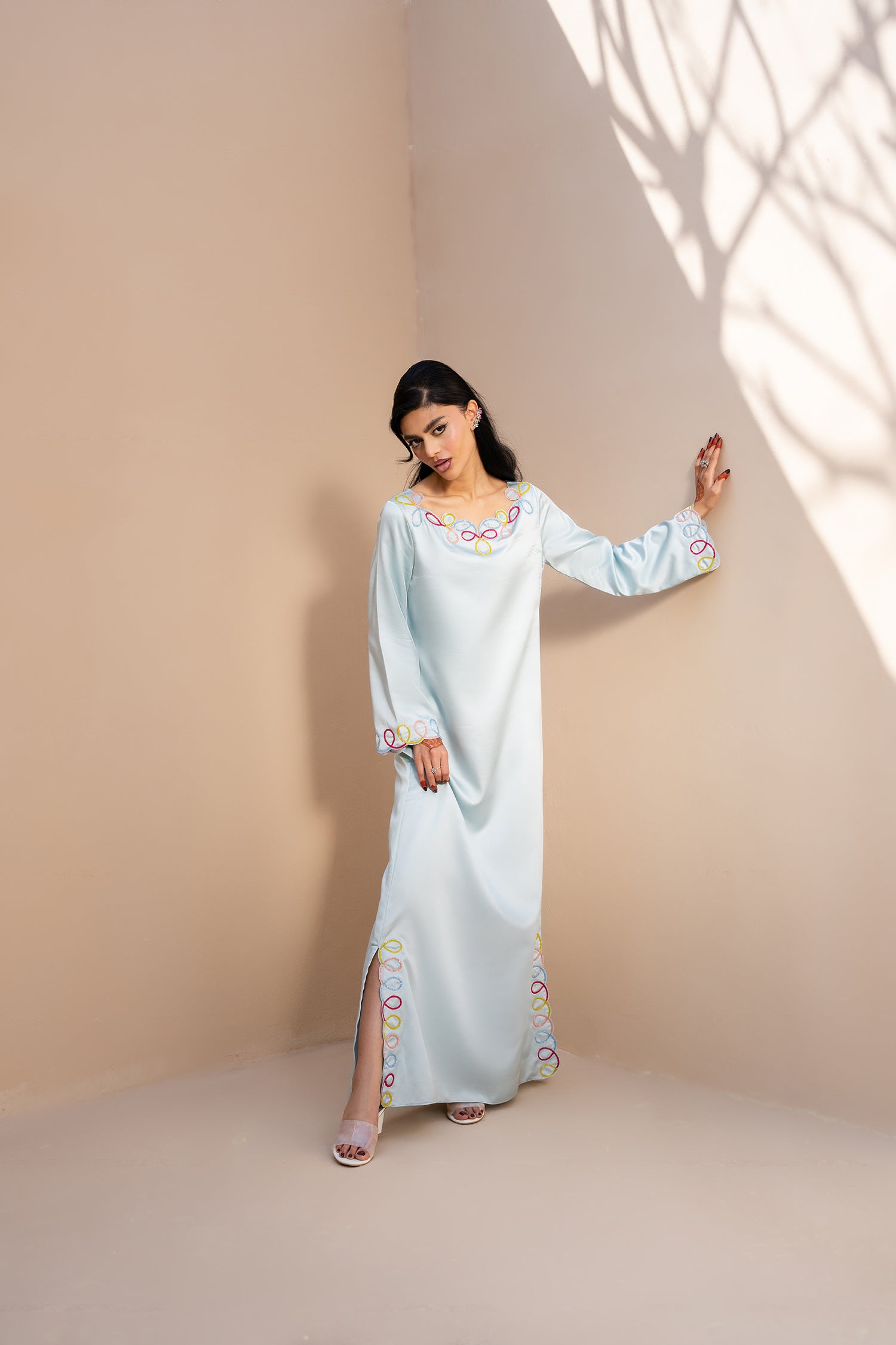 Elevate your festive wardrobe with this sky blue shamoz silk kaftan, crafted in luxe, fully lined fabric for a flawless fall and comfortable fit. Designed with a statement multicolored neckline, hem chaak, and sleeve detailing, this piece blends contemporary elegance with soft pastel charm. Pair it with the pastel tie-dyed organza dupatta for an ethereal occasion look, or wear it without for a minimal, chic silhouette. Perfect for Eid, festive gatherings, wedding events, and formal dinners, this versatile kaftan offers effortless sophistication with a modern edge.Available with and without organza dupatta.